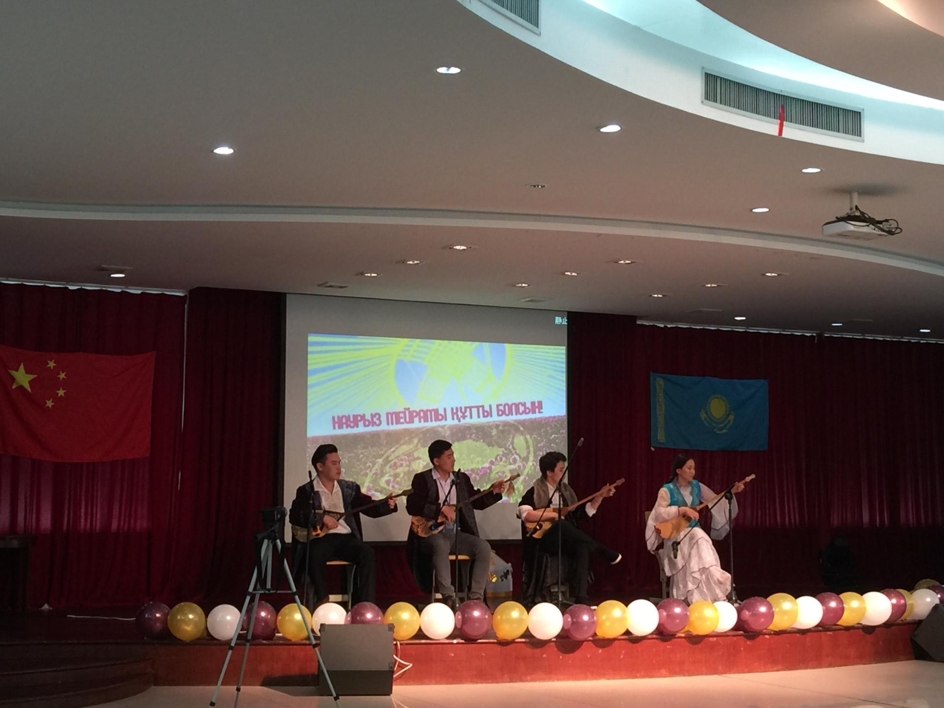 活动中,哈萨克斯坦学生们准备了丰富多彩的民族节目,他们身着哈萨克的民族服装时而欢舞、时而歌唱,在冬不拉优美而轻快的乐声中徜徉;他们摔跤、掰手腕展现草原民族的激情和力量。留学生们还亲手制作了非常丰盛的哈萨克传统美食,有香甜的包尔沙克、也有浓郁的那吾热孜汤等。大家边享用美食边观赏节目,其乐融融。期间,全场哈萨克留学生手拿国旗共唱哈萨克传统歌曲,将现场推向高潮,洋溢着浓浓的节日气氛。