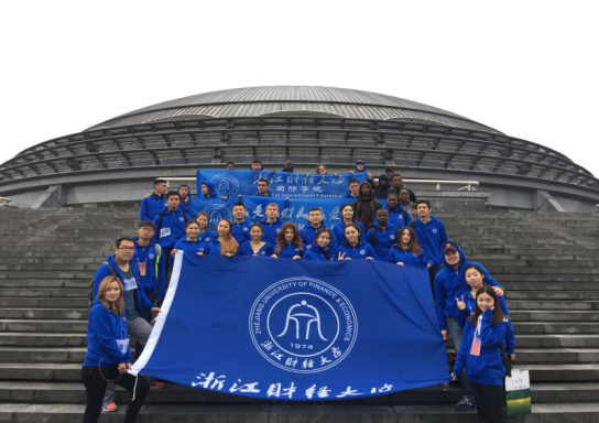 留学生身着印有“浙江财经大学’校徽的蓝色服装,旗手举着浙江财经大学校旗,踏着整齐的步伐统一入场,方针队伍整齐划一。