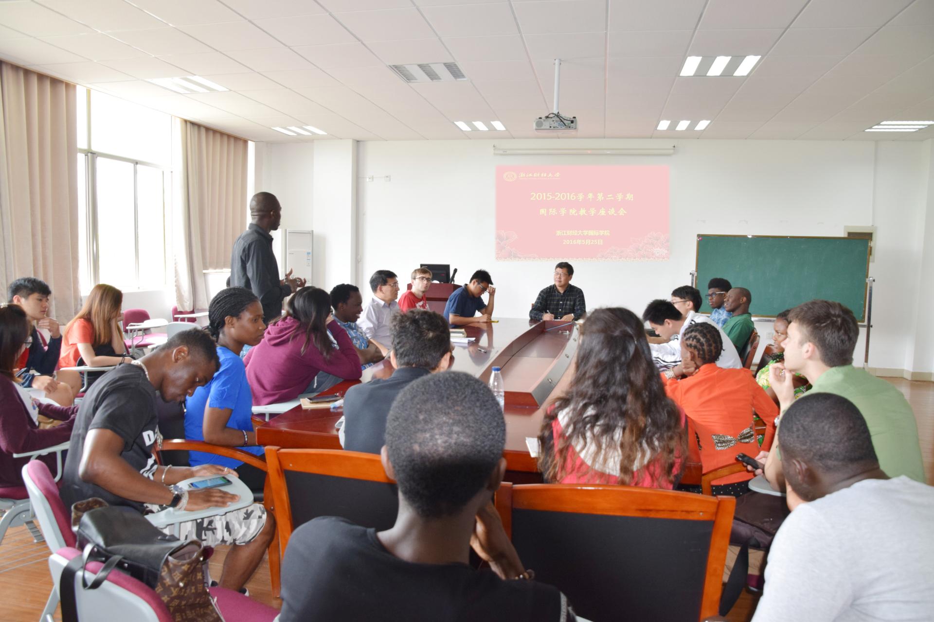 近日,球探体育比分 组织留学生代表和相关教师在105会议室召开了2015-2016学年第二学期教学座谈会。此次会议由管春林副院长主持,会议主要围绕课堂教学展开,与会的留学生和教师代表畅所欲言,就教学方法、授课语言、教学排课、教学评价等情况进行了交流反馈,并提出了意见和建议。