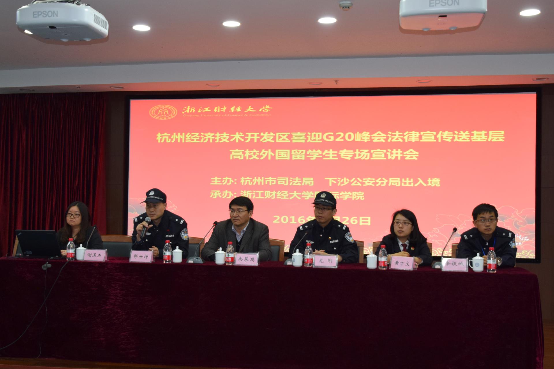 4月26日,为帮助外国留学生了解我国的法律法规,提高他们的法律意识,增强他们的法制观念,以保证G20峰会期间球探体育比分外籍人员的安全稳定,来自杭州市公安局经济技术开发区公安分局出入境管理大队、杭州市经济技术开发区司法局和白杨派出所的警官联合为球探体育比分留学生带来了“喜迎G20--留学生法制宣传”讲座。