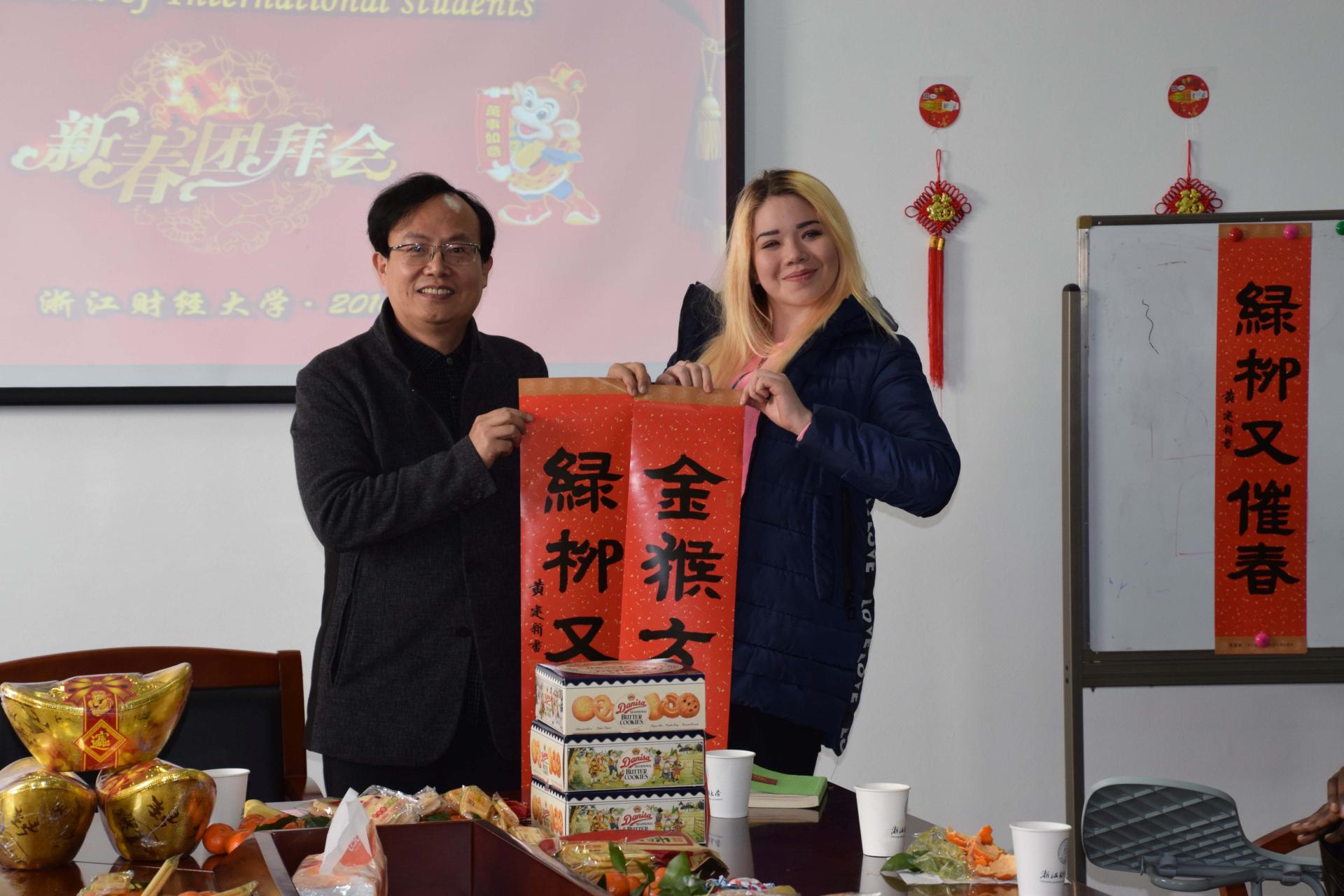 会议室。在工作人员的努力下,会议室已布置成了热闹欢腾、一派喜庆的景象。黄建新副校长与到来的留学生进行了亲切交谈,仔细询问了他们的生活情况和假期安排,叮嘱他们一定要注意安全,希望他们合理安排好假期的学习和生活,充分利用好这次在中国过春节的机会好好感受中国传统节日的浓厚氛围,加深对中国文化的了解。活动中还特别组织了中国特有的春节发红包互动,管院长介绍了春节的相关知识。最后,黄建新副校长代表学校祝广大留校留学生春节愉快,并为每位留学生送上了亲自书写的春联和假期慰问品。