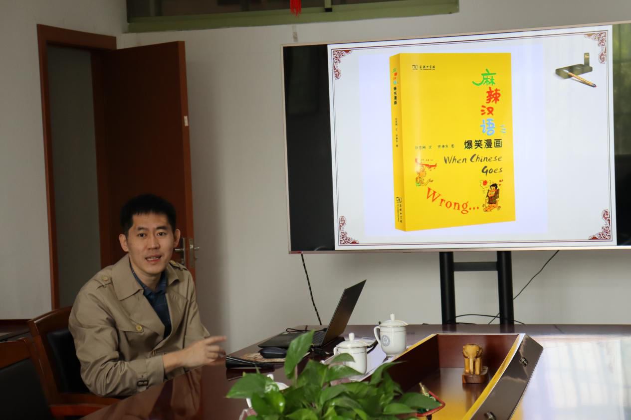 讲座伊始,刘志刚老师先分享了自己在人生和事业道路上的经历和感悟,对国际汉语教学这份工作的热爱之情溢于言表。之后,围绕着新作《多媒体辅助汉语教学案例集》,刘老师以“你好”“几岁”“到底”“相亲”“中国行政区划”等词汇语法点和文化教学点为例,展示了真实课堂环境下如何使用视频素材辅助汉语教学,用直观的方式说明了影视视频教学素材的真实性、趣味性、形象性和多维一体性等多重特点。最后,丰富有趣的视频教学素材引发了在座教师们的热烈讨论,刘老师一一答疑,并且向教师们推荐了大量线上参考材料和教学资源。
