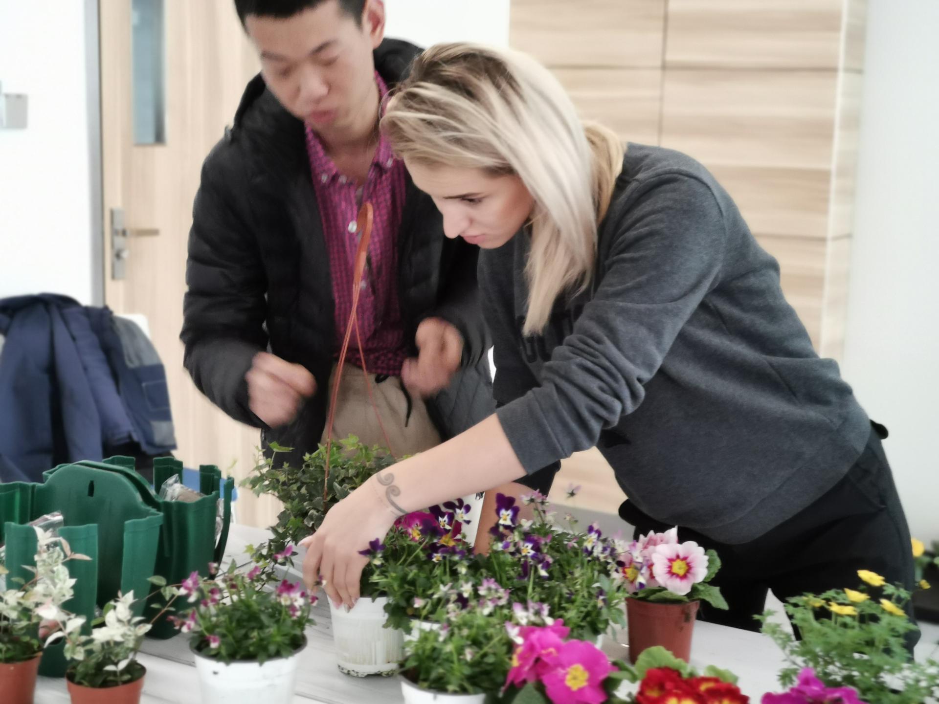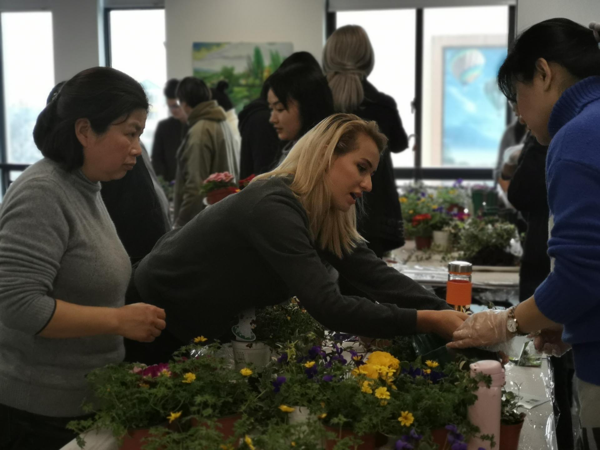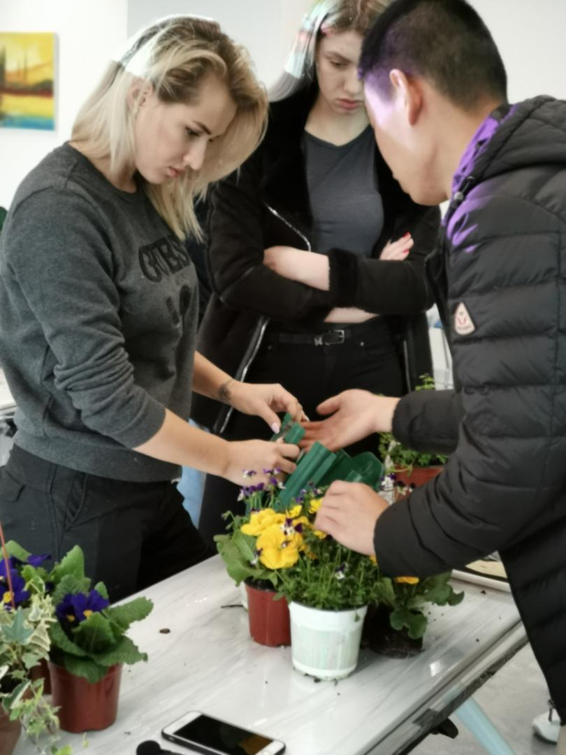 在简短的欢迎仪式后,在虹越花卉A GU老师的带领下,留学生们走进了立体花挂组合的课堂,切身体验种植组合盆栽的乐趣。随后,留学生们就学以致用,当起了老师的小助手,帮助中国学员一起制作立体花挂。现场气氛热烈,欢声笑语阵阵,掌声此起彼伏。