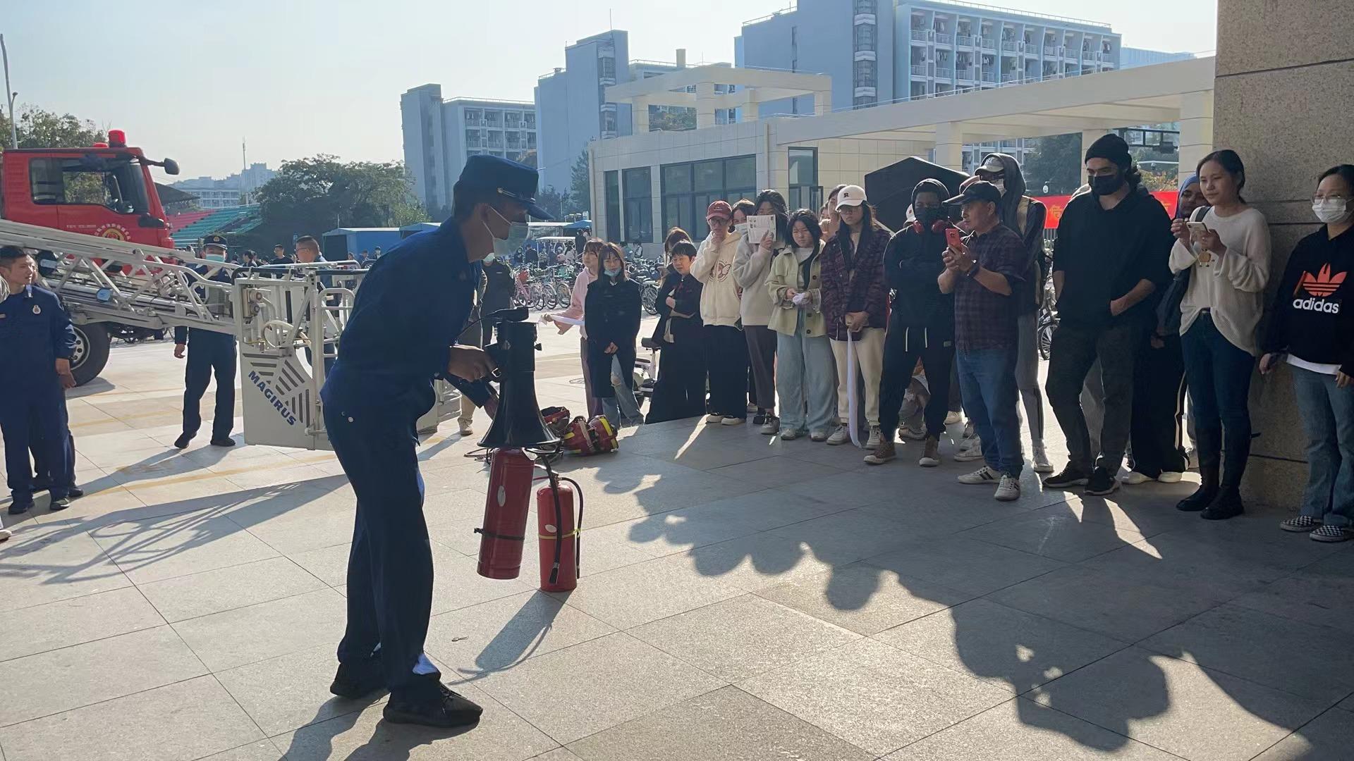 演练现场,消防员向在场国际学生进行了消防知识培训,详细讲解了如何预防火灾发生、发生火情时应急疏散的注意事项以及灭火器的使用方法等消防安全知识,同时现场演示了灭火器的正确使用方法。随后,在场留学生们轮流使用灭火器对火源进行扑救,在培训和实操中,进一步强化了安全意识、普及了消防知识,也检验了大家的疏散能力和应急自救能力。