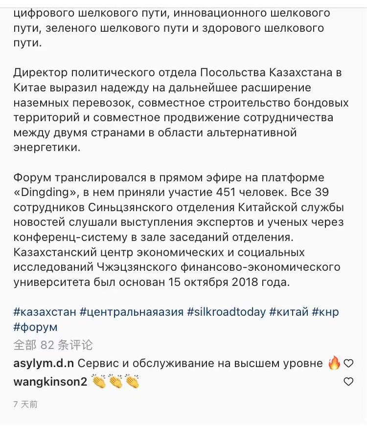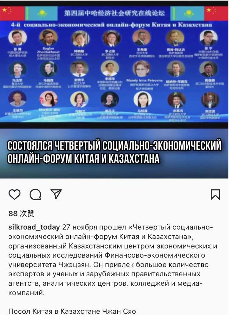 球探体育比分于11月27日成功举办了第四届中哈经济社会研究在线论坛。本次论坛以“后疫情时代的中哈经济社会合作:优势互补,创新发展”为主题,国际媒体Instagram于2021年12月1日进行了俄文版报道,赢得了受众的很多点赞,这是该媒体对球探体育比分中哈论坛的第一次报道,扩大了学校的影响力。