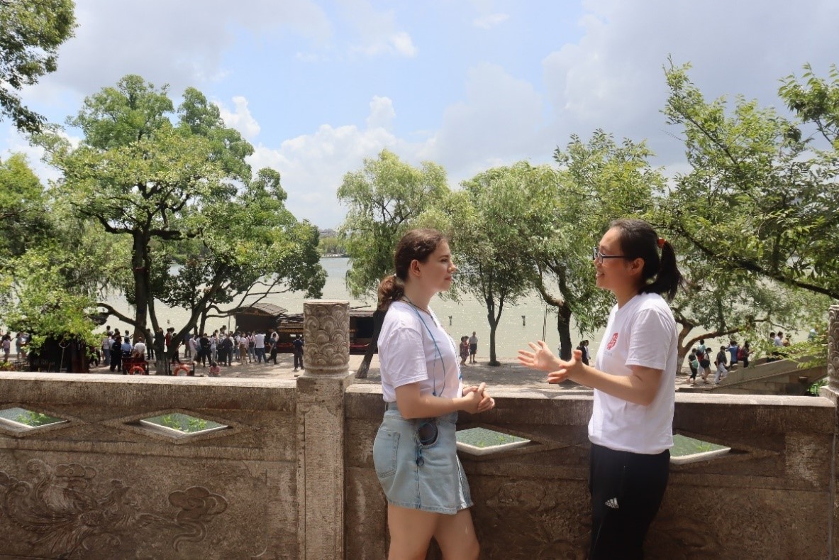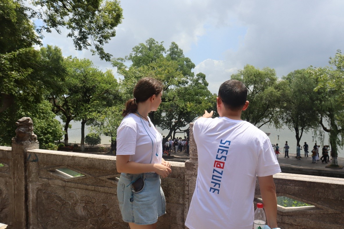 湖心岛上的烟雨楼,得名于唐朝诗人杜牧的诗句——“南朝四百八十寺,多少楼台烟雨中”。登烟雨楼望南湖景色,别有情趣。楼中还藏有许多文人墨客的诗词,留学生们被墨宝吸引,纷纷拍照留念,几位中文比较流利的同学还尝试朗诵诗词。