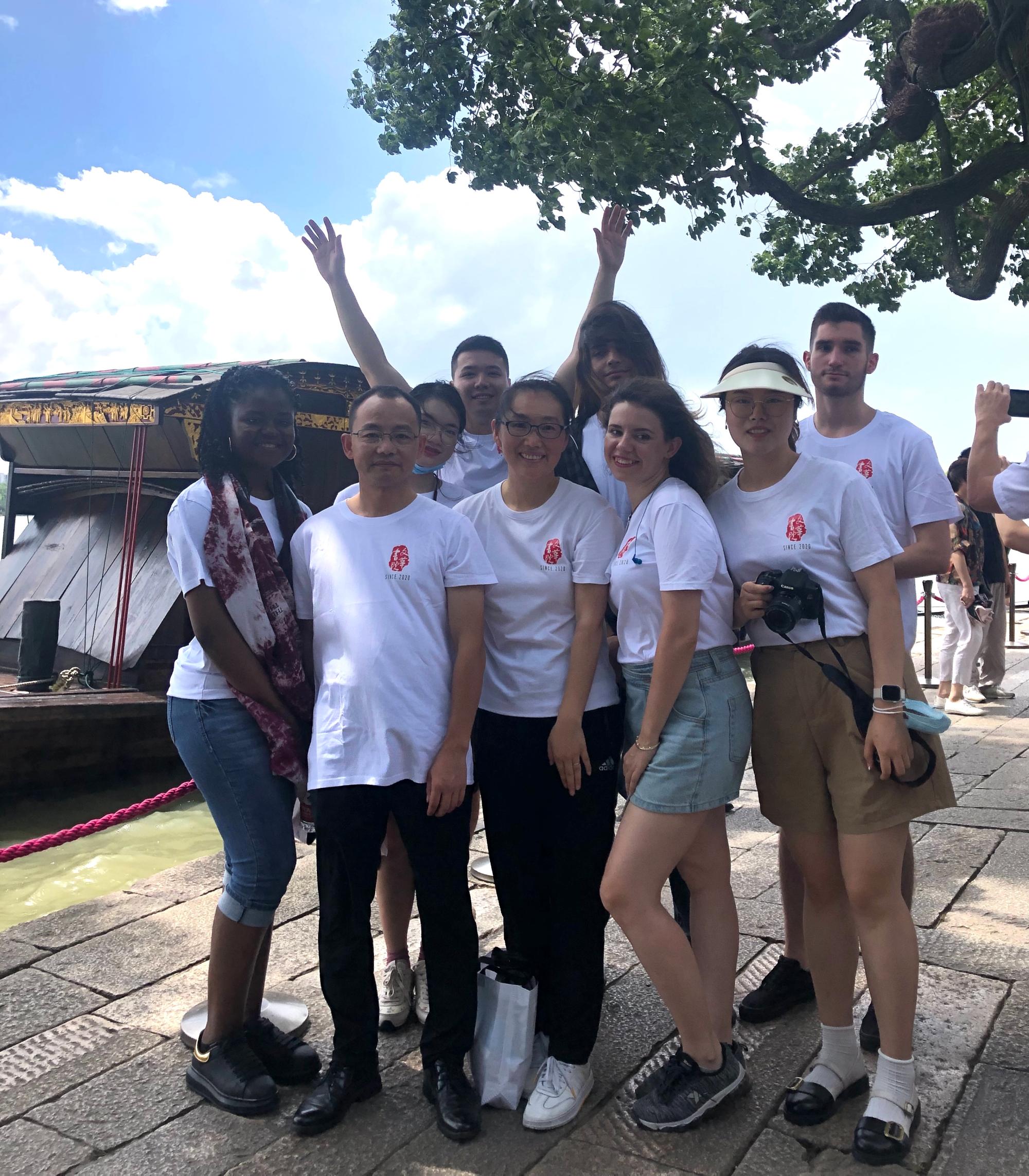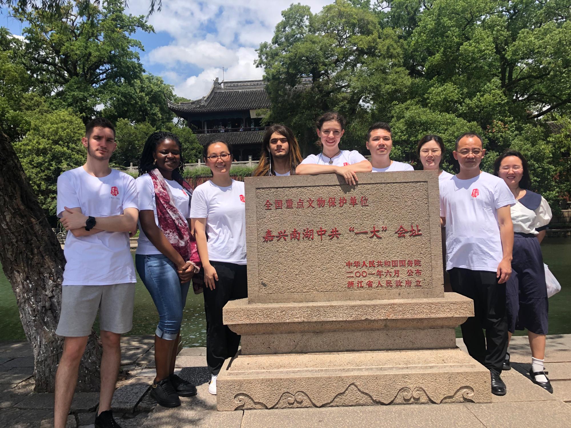 的留学生和老师们来到嘉兴南湖,参观南湖红船,追溯红色记忆。