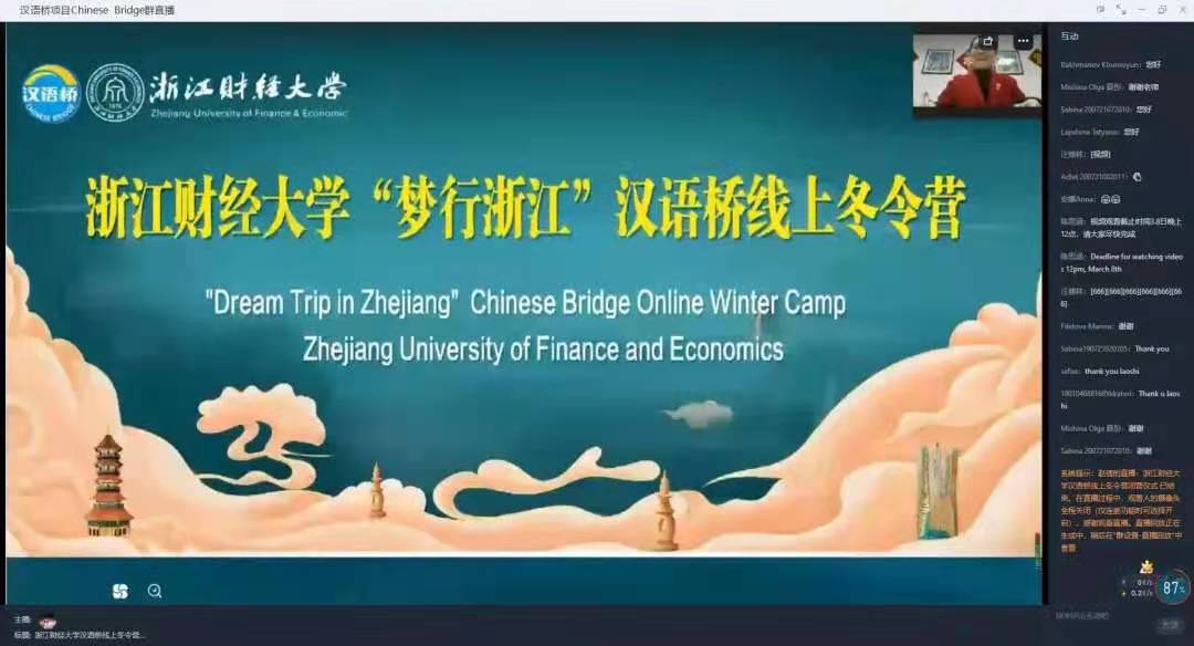 在疫情防控常态化背景下,浙江财经大学本次“汉语桥”线上团组交流项目通过内容丰富、形式多样的云课堂、云体验,让各国学生在线上领略了中文的美丽,感受中华传统文化和当代中国的魅力,激发学员们的学习热情,搭建全球友谊之桥。参营的学员们在弹幕中表达了对本次“汉语桥”的喜爱,以及对全体教师的感谢,共贺“梦行浙江”汉语桥顺利闭营!