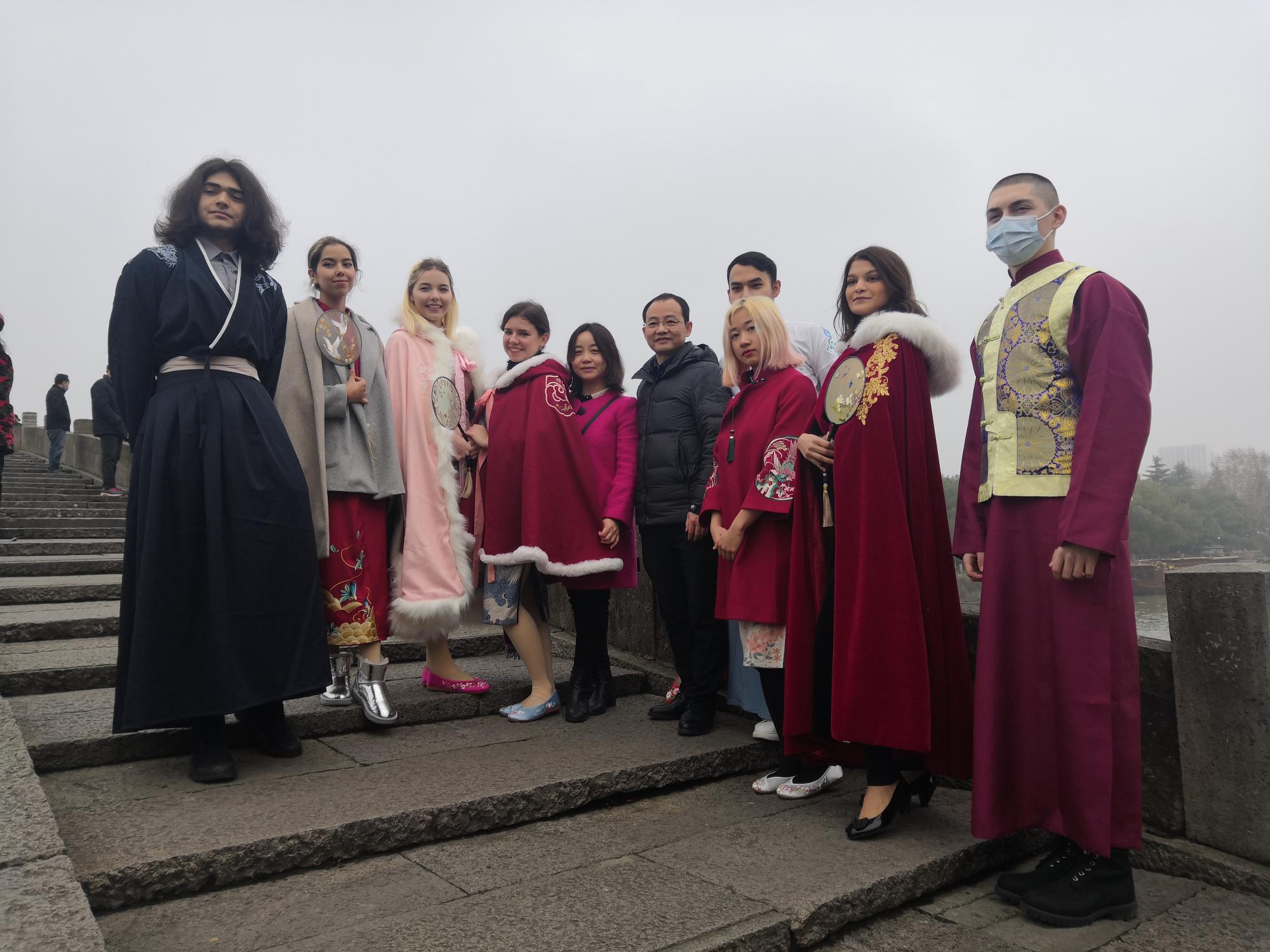 在京杭大运河拱宸桥上,留学生们身着旗袍、唐装和汉服,撑着油纸伞,摇着丝绸扇展示正在走向全世界的东方之美。