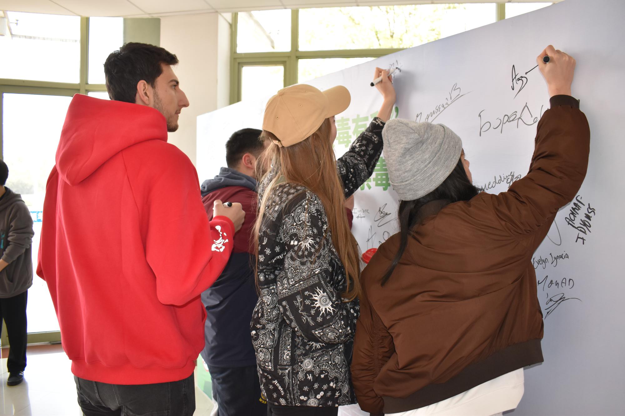 讲座结束后,在场的外籍师生纷纷在“护航亚运 禁毒有我”的签名墙上郑重签名,表达禁毒拒毒的信心和决心。师生们通过校园健身走的方式,在感受美丽校园的同时,以健康生活和强健体魄迎接杭州亚运会。