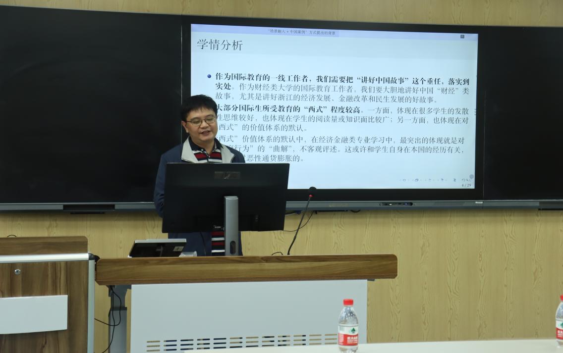 古昕博士以丰富的教学经历和诙谐幽默的语言,从学情分析出发,分析了国际学生与中国学生在学习理念、学习思维方面差异,通过生动案例,展示了独特的留学生课程教学方法。倪文斌教授以《Operation Management》为例,从理论教学、实践操作两方面详细讲解了留学生课程授课的方法和策略。孙久荣副教授认为教师要以学生为中心,基于目标导向,根据学生背景做好教学设计,并建议应注重与留学生的共情交流。