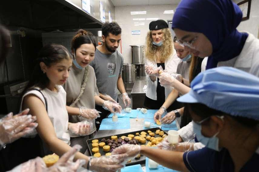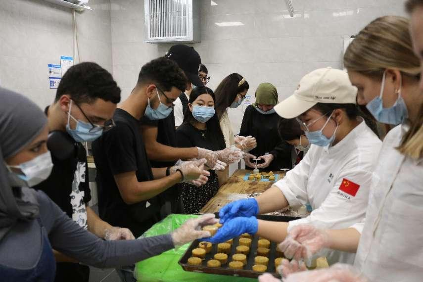副院长黄志雄分别为留学生介绍了中秋节的传统习俗以及月饼在中秋节的意义。面点师为在场师生详细演示了月饼制作的方法和技巧,从揉面团、包馅、放入模具内按压敲打成型等步骤逐一讲解。留学生们一开始显得有些手足无措,但在面点师的耐心指导下,大家迅速进入状态,纷纷动手尝试。现场气氛热烈,大家相互探讨,分享各自的制作心得,欢声笑语不断。