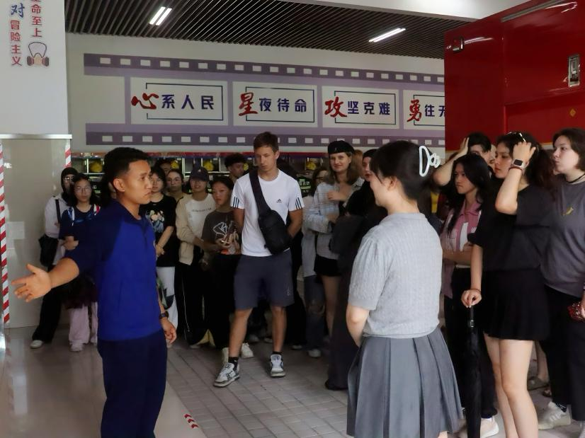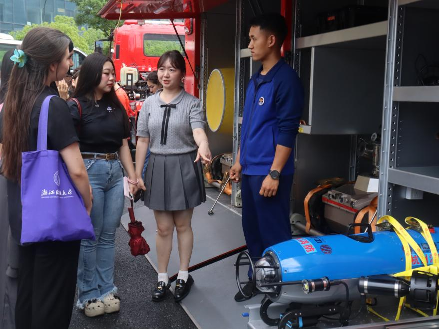 随后,消防员重点展示了近年来配备的新型智能消防救援设备,如热成像仪、消防机器人、无人机等高科技装备。通过现场演示,国际学生们直观了解了这些设备在复杂火场环境下的应用优势,对智能化消防技术赞叹不已。