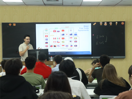 FORSTER MARCO DUNG(黎勇)系我校2018届国际经济与贸易专业本科毕业生,目前任协力管理咨询公司(Dezan Shira & Associates)东盟总监一职。讲座上黎勇以详实的数据和生动的案例,深入分析了东盟与中国经贸合作的最新趋势以及中国企业在东盟的投资动态等内容。讲座结束后,黎勇与在场师生进行了互动交流,耐心解答了关于区域经济合作、投资机遇等热点问题。他深情回顾了在母校的学习经历,并感恩母校和师友长期以来对他职业发展的支持。