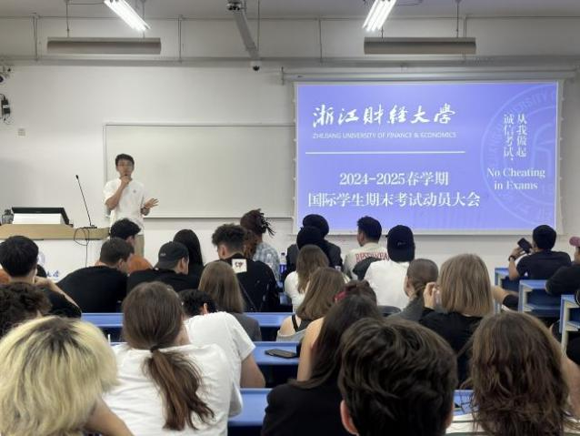 随后,国际学生辅导员汪博林详细解读了《浙江财经大学考场规则》、《浙江财经大学国际学生违纪处分规定》等文件,并结合历年考试作弊案例,向同学们重申了作弊行为对个人学业、奖学金申请以及未来发展的严重后果。