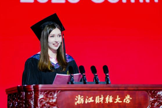2021级电子商务专业本科生安娜(俄罗斯籍),作为毕业国际生代表上台发言。从俄罗斯来到校园,从学习汉语到古筝书画、从“挑战杯”鏖战到创业实践,安娜深情告白:“浙财教会我把真实的中国故事讲给世界听!”让“一带一路”沿线闪耀浙财之光。