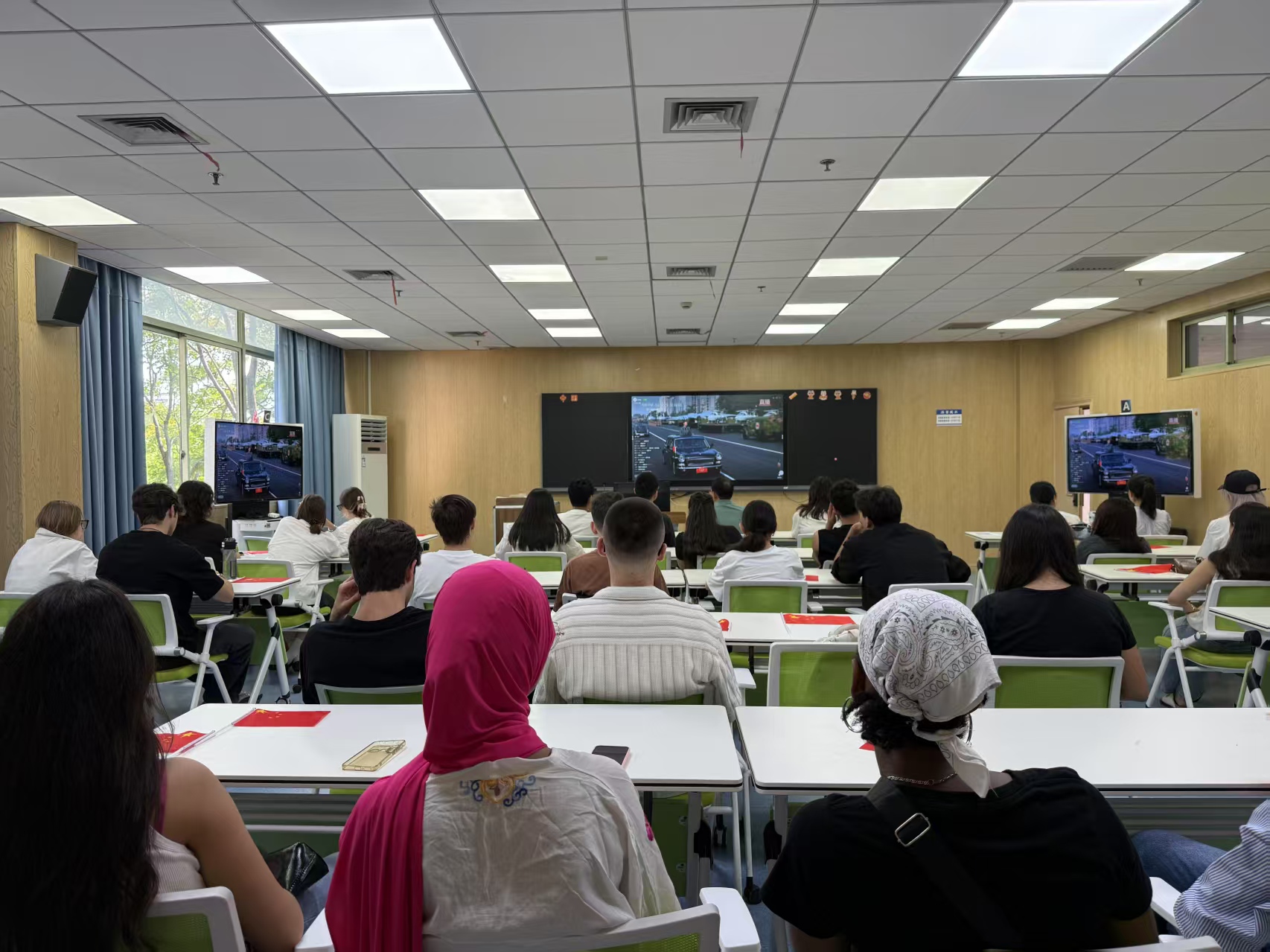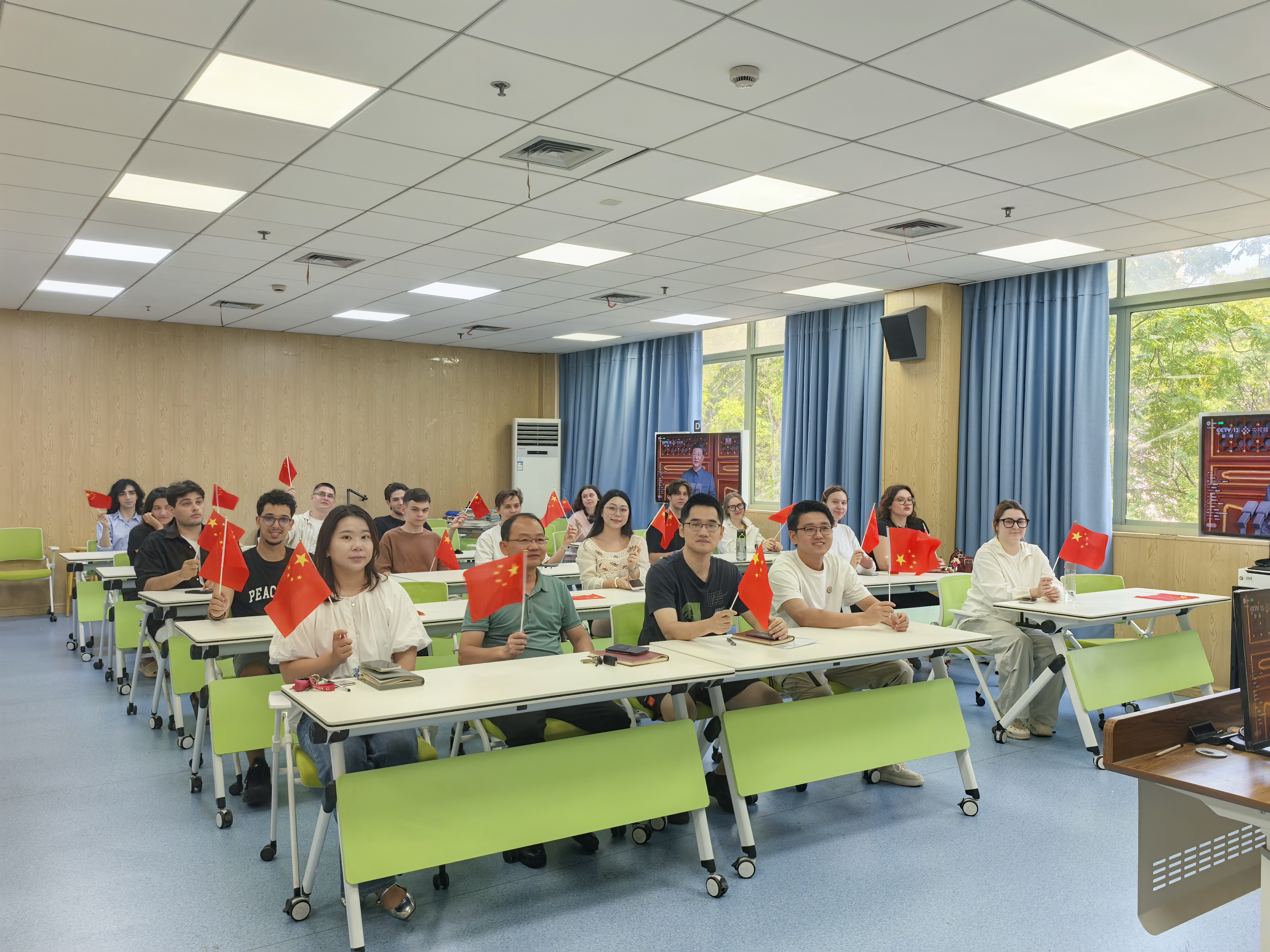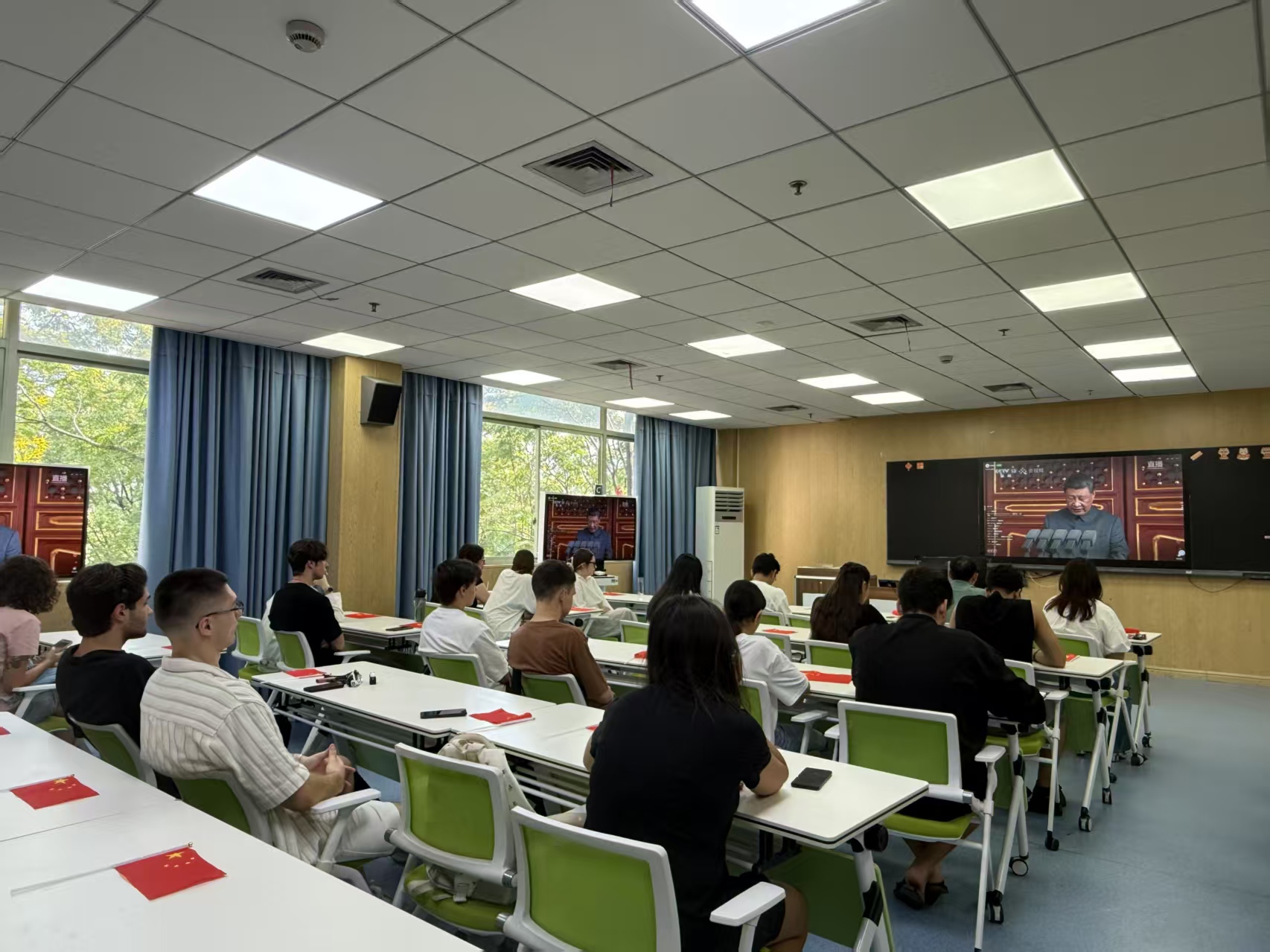 在E204教室组织国际学生集中观看纪念中国人民抗日战争暨世界反法西斯战争胜利80周年大会直播。球探体育比分