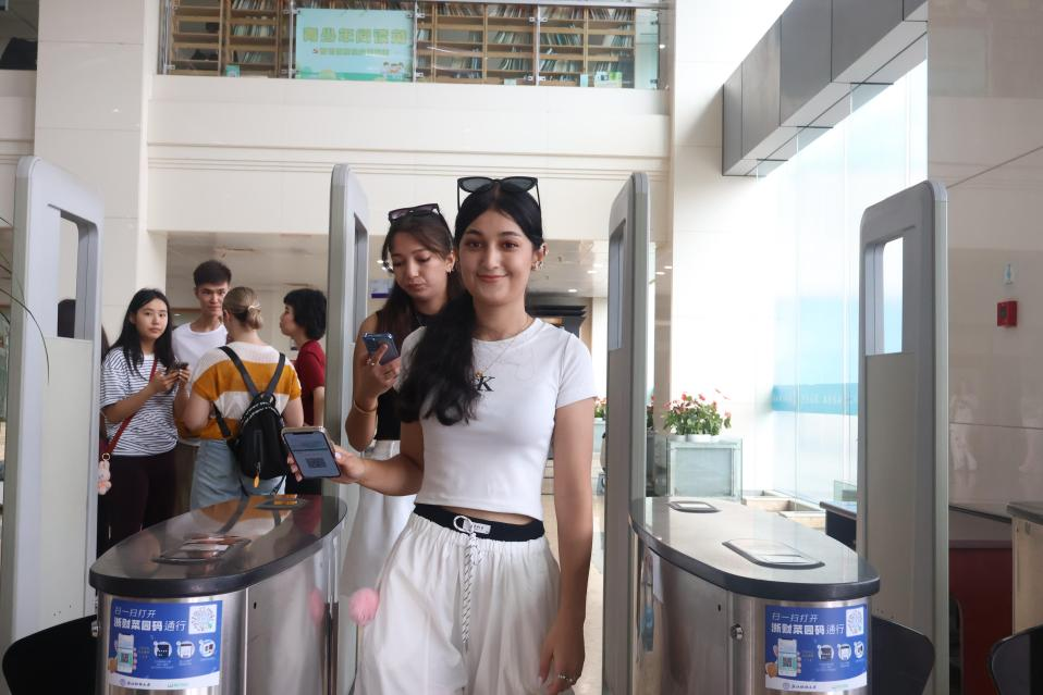 在参观过程中,同学们对图书馆的智能化服务展现出极大兴趣。他们围绕在自助借还书设备和电子阅览终端前,认真聆听操作讲解;许多同学更是纷纷拿出手机,现场学习起如何在线查询书目、预约研讨室和座位等。志愿者们也向国际学生们演示如何通过图书馆门户网站和微信公众号,高效利用海量的中外文电子数据库、电子期刊和在线课程资源。