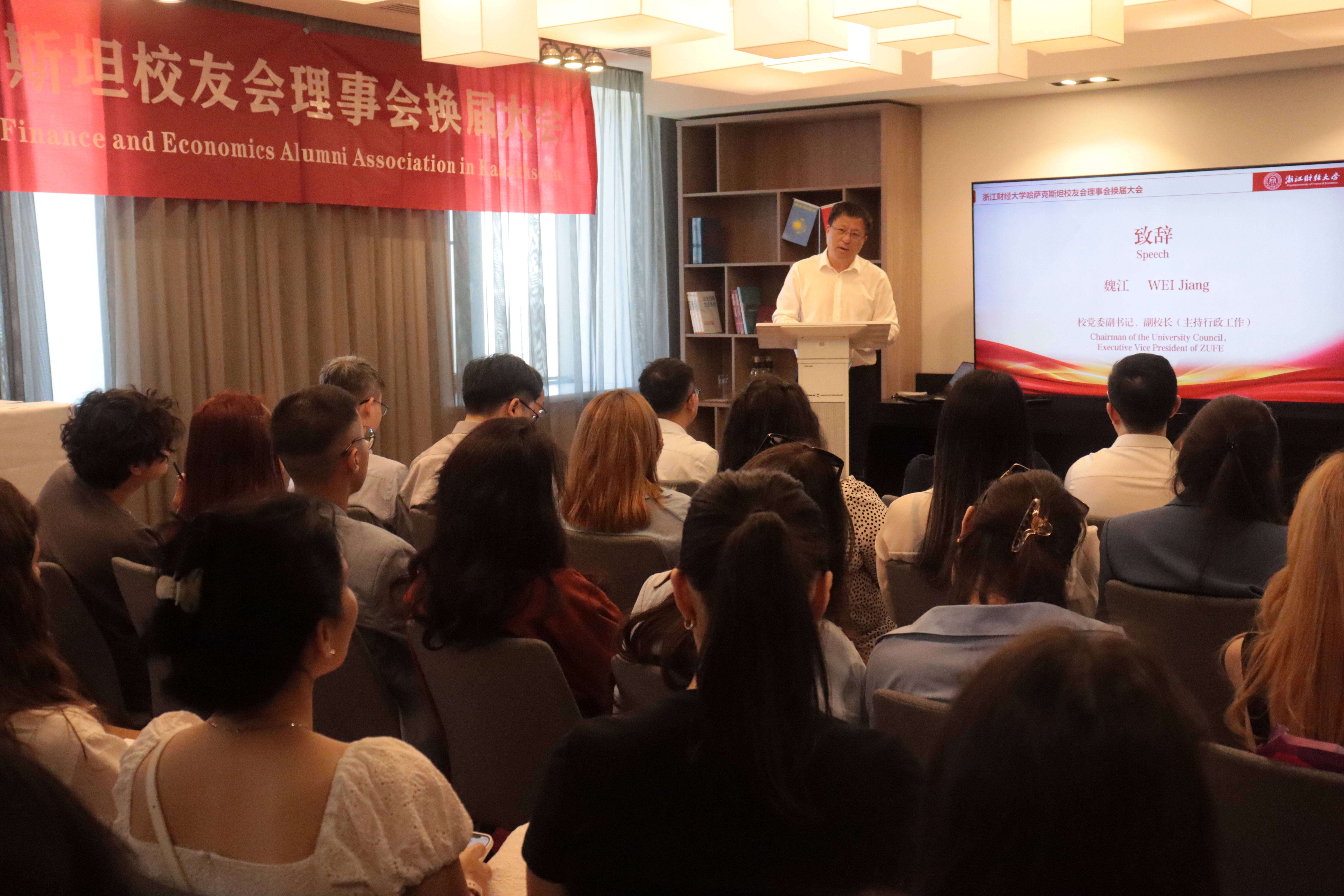 换届大会上,魏江校长首先向哈萨克斯坦校友介绍了学校发展取得的成绩,他饱含深情地说,“母校一直惦记着你们,你们是中哈双边的大使,要抓住中哈友好合作的历史机遇,将个人的成长与母校发展、中哈合作紧密结合起来,争做浙财大杰出校友。”他诚挚邀请校友们回母校参加五十周年校庆。