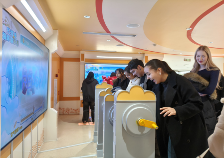 研学最后一站,趣味互动展区成留学生理解“产业发展与时代同步”的重要窗口。通过互动游戏、企业发展微电影和时间轴展板,康师傅从创业初期手工操作到如今全自动化生产、从单一产品到多元化食品的发展历程清晰呈现。班主任结合商务英语专业产业分析课程解读:“中国企业发展不仅是技术升级,更是对市场需求、民生改善的精准回应。康师傅成长史是中国食品产业市场化、国际化的缩影,对从事国际商贸、跨文化商务沟通的大家极具价值。”留学生认真记录企业创新策略与产业升级路径,纷纷表示对中国企业市场运作模式有了更直观认知。