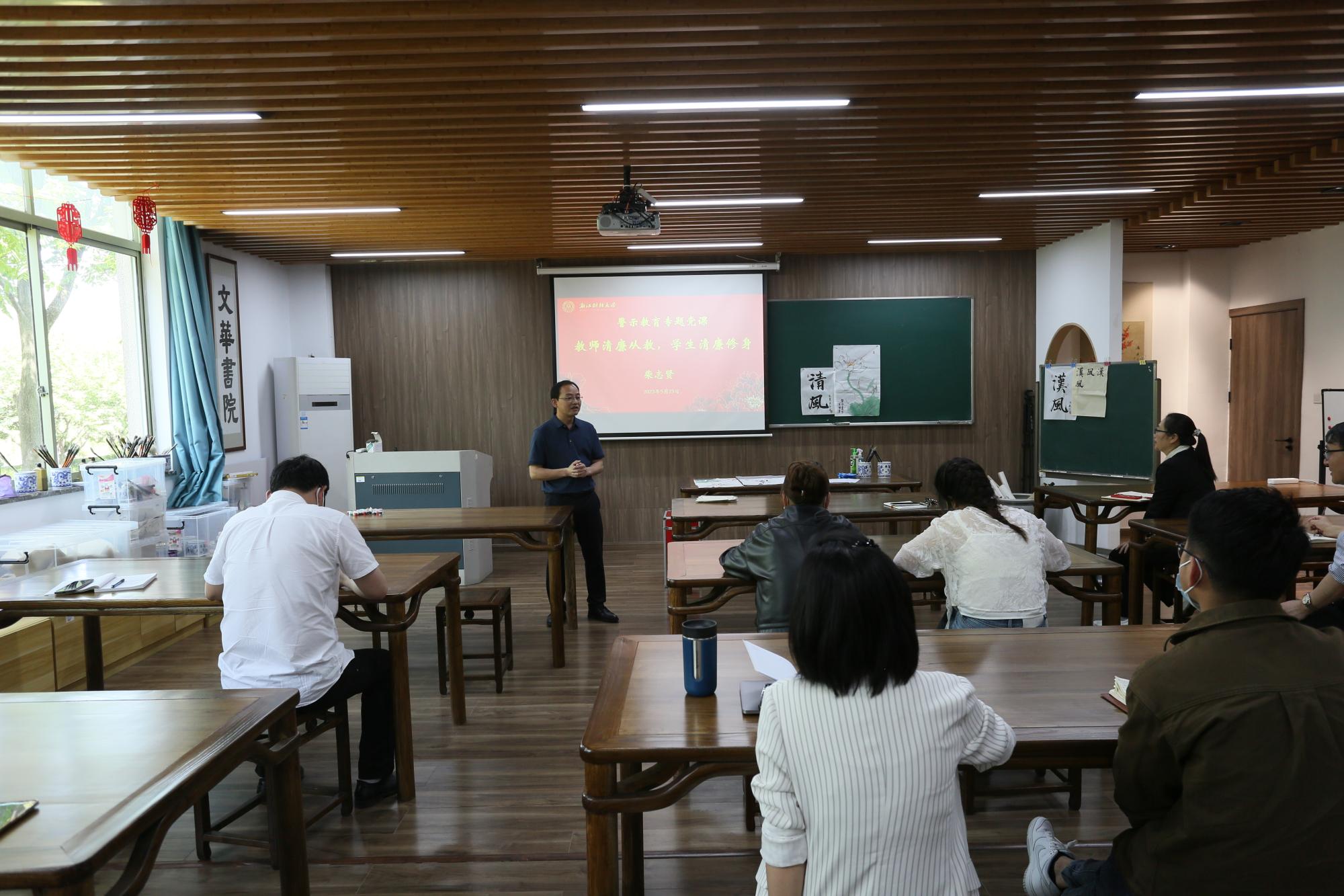 院长柴志贤讲授题为“教师清廉从教,学生清廉修身”的警示教育专题党课,警示全体党员坚定职业信念与职业操守,确保清正廉洁,自觉地在教学、科研、社会服务等工作中遵守师德师风,营造风清气正的校园环境。