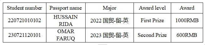 为加强留学生创新能力培养,提高学术创作能力,学院于12月18日举行了首届留学生学术作品大赛评审。经专家评审,共评选出一等奖1名,二等奖1名,现将获奖学生名单公布如下: