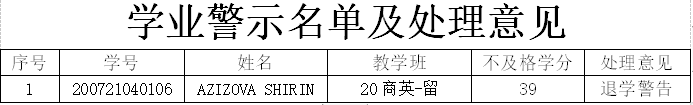 决定向AZIZOVA SHIRIN提出退学警告。
