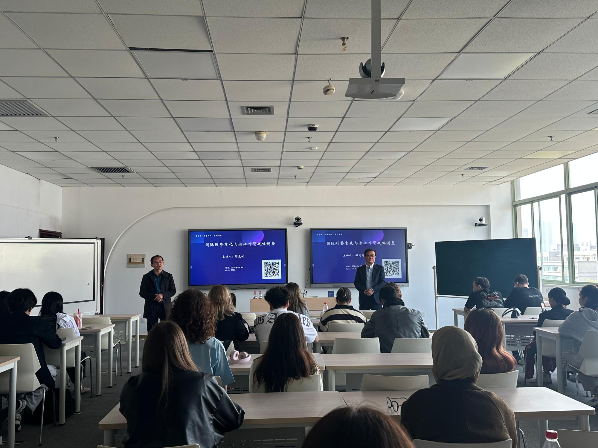 4月9日下午,汇孚集团董事长邵龙河来球探体育比分为留学生作了题为“国际形势变化与浙江外贸战略调整”的专题讲座,近五十名留学生参加了讲座。