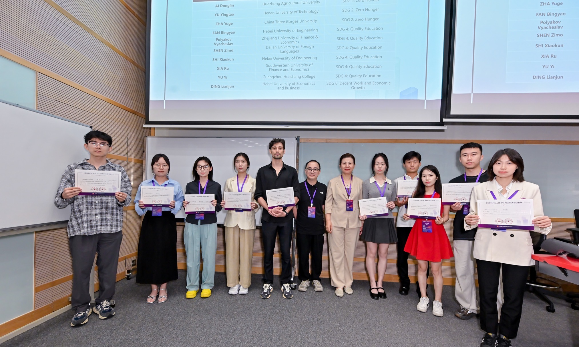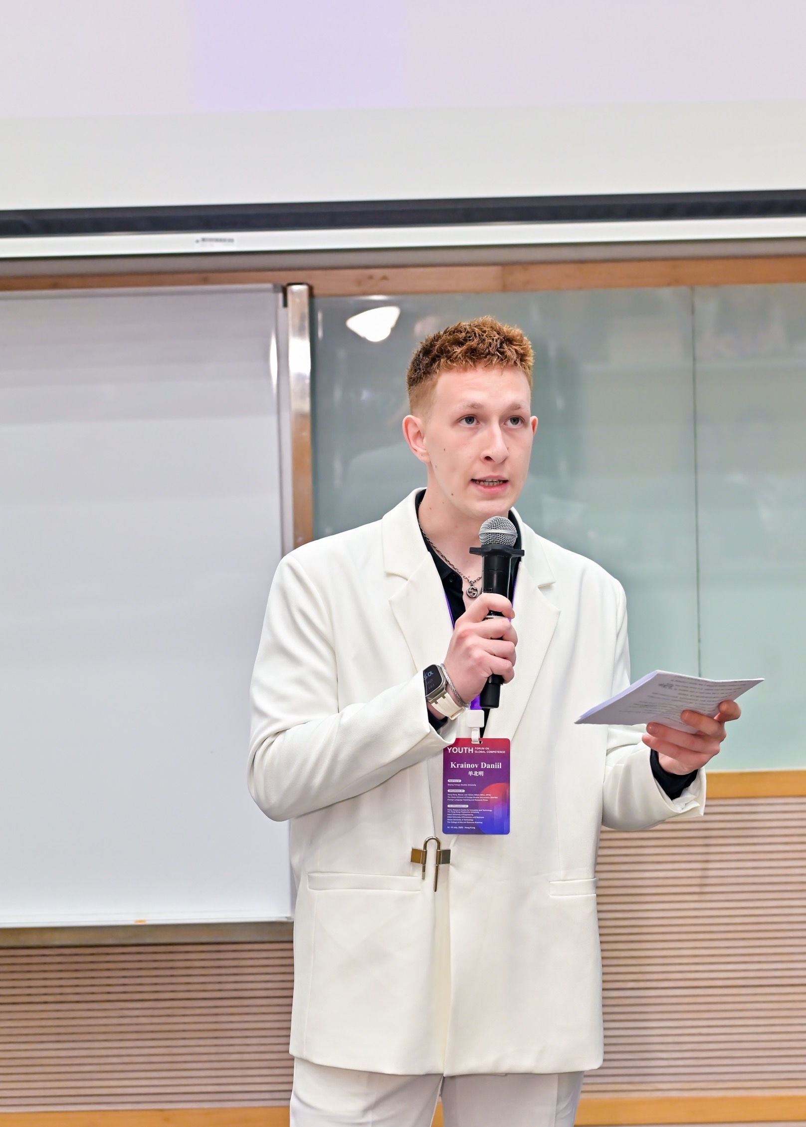 论坛期间,39位青年代表围绕联合国可持续发展目标(SDGs)分享思想,提出主张,展现了全球青年的担当。我校国际学生POLYAKOV VYACHESLAV(韦辰)从我校学习经历出发,畅谈教育改革,他指出既要发挥教学工具创新效能,构建游戏化与沉浸式双引擎驱动教育模式,更应注重教风、学风建设,支撑教育回归育人初心,回归求知本源。其掷地有声的演讲感染了在场评委与青年代表,并获评“优秀发言代表”。国际学生Krainov Daniil(单北明)应邀担任了闭幕环节的主持人。