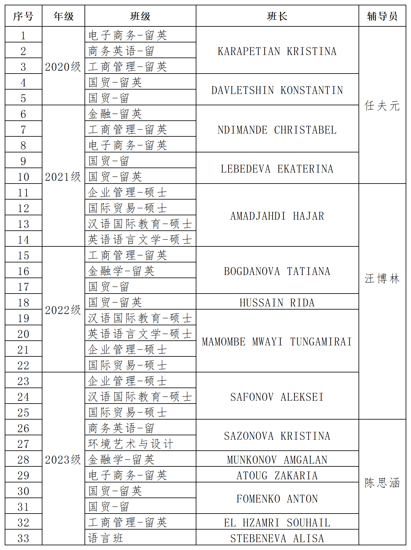 为贯彻落实学校学生管理、服务工作要求,进一步加强国际学生“一站式”社区网格化管理建设,实现国际学生自我教育、自我管理和自我服务,现将国际学生辅导员和班长名单信息公布如下: